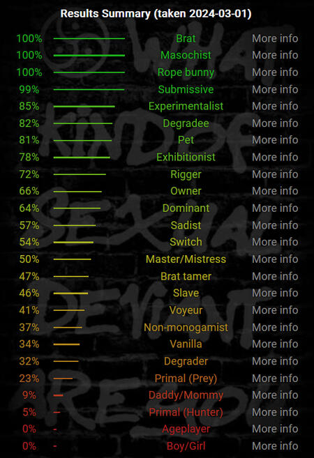 this screenshot portrays an accurate yet brief portrayal of my kinks. because of this, i've included some more detailed information about my kinks below:- i'm almost completely submissive, although i can be a switch.